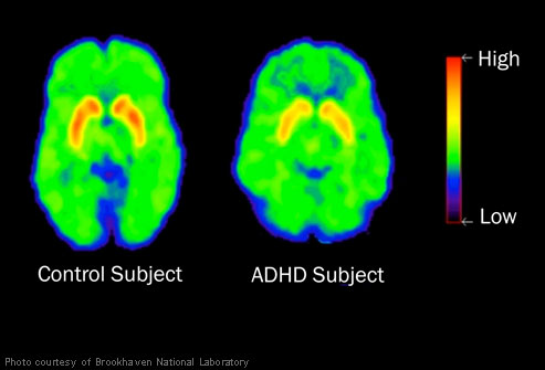 Một nghiên cứu mới đây bởi Tiến sĩ Nora Volkow so sánh não bộ của 53 người trưởng thành ADHD không sử dụng thuốc và não bộ của 44 người trưởng thành khỏe mạnh không mắc ADHD trong giai đoạn từ 2001 tới 2009, sử dụng thiết bị chụp não PET (positron emission tomography – chụp cắt lớp phát xạ positron). Nghiên cứu này tập trung vào các thụ thể dopamine, mà truyền tín hiệu tới các khu vực cách xa trong não bộ, và các đơn vị vận chuyển dopamine, mà tái chế lượng dopamine bị thừa còn sót lại sau khi tín hiệu đã được truyền đi. Nghiên cứu phát hiện ra rằng cả các thụ thể lẫn các đơn vị vận chuyển đều bị suy giảm ở số lượng trong các não ADHD so với các não bình thường. Lượng thụ thể bị suy giảm nhiều khả năng là hậu quả của sự vận chuyển chậm chạp và kém hiệu quả xảy ra trong cả mạng lưới. Các đơn vị vận chuyển từ đó bị suy giảm ở số lượng để làm chậm lại quá trình gửi dopamine ngược lại kho tích trữ. Điều này cho phép dopamine được giữ lại trong synapse (điểm giao thoa giữa các tế bào thần kinh) trong một khoảng thời gian dài hơn. Ritalin giúp đạt được tác động tương tự, và đây được cho là lý do chính vì sao nó có tác dụng.